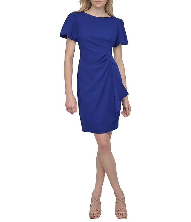 Kensie Stretch Boat Neck Mid Length Bell Sleeve Twist Waist Faux Wrap Skirt Sheath Dress