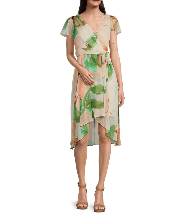 I.N. San Francisco Floral V-Neck Off The Shoulder Flutter Sleeve Triple Tiered Dress
