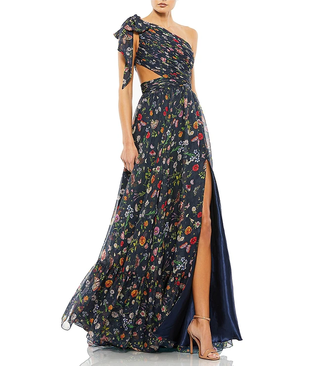 Mac Duggal One Shoulder Sie Cut Out Floral Print Chiffon Gown