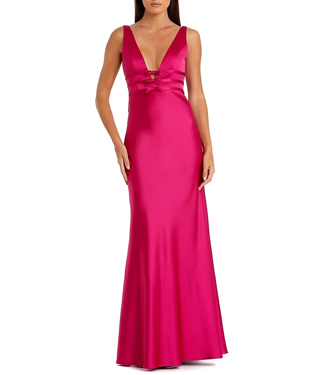 Mac Duggal V-Neck Sleeveless Bow Trim Satin Sheath Gown