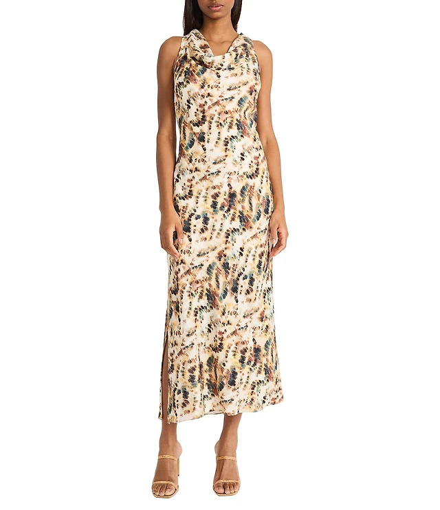 Donna Karan Printed Woven Cowl Neck Sleeveless Column Midi Dress