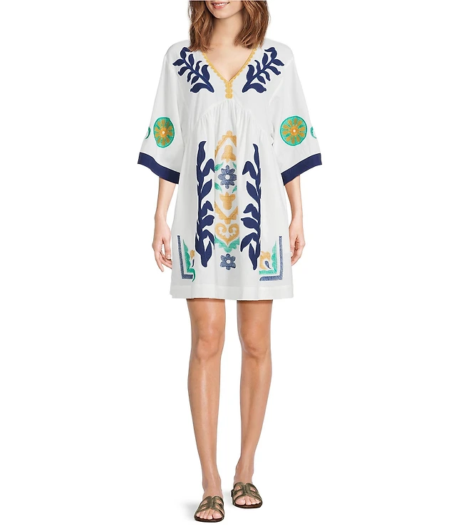 JOHNNY WAS Embroidered Floral Cotton Knit Crew Neck Short Sleeve Asymmetrical Ruffle Hem Midi Dress