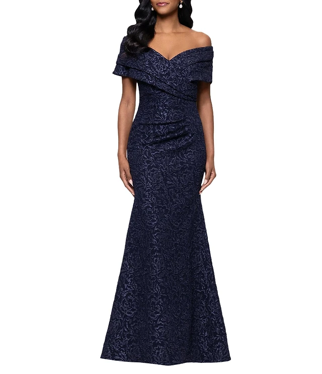Betsy & Adam Metallic Crinkle V-Neck Long Sleeve Wrap Bodice Gown
