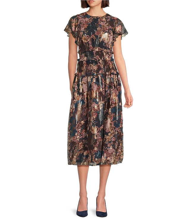 Ignite Evenings Floral Print Chiffon Tea Length Flutter Sleeve Tiered Dress