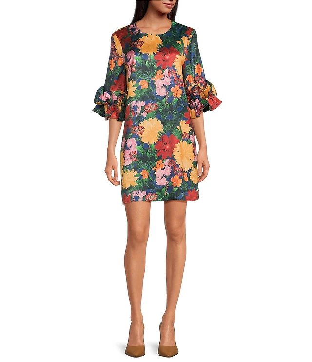 Honey & Sparkle Flocked Mesh Floral Print Boat Neck Long Bell Sleeve Dress