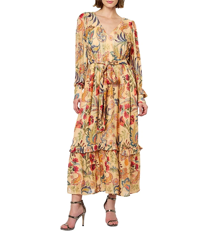 Jude Connally Kitty Italian Paisley Claret Print Point Collar Long Sleeve Button Front Tie Waist Maxi Dress