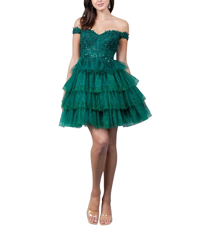 Cinderella Couture Off-The-Shoulder Beaded Sequin Tiered Ruffle Lace Up Back Fit-And-Flare Dress