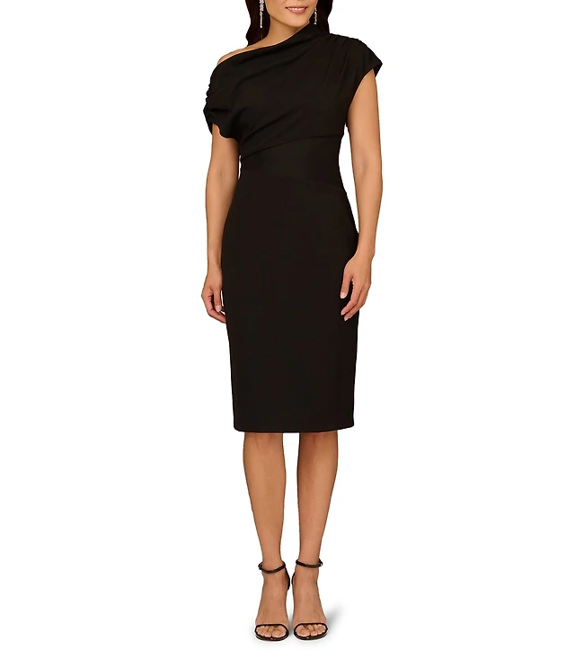 Dress the Population Kacey Strapless Asymmetrical Bodice Pleated Skirt Front Slit Midi Dress