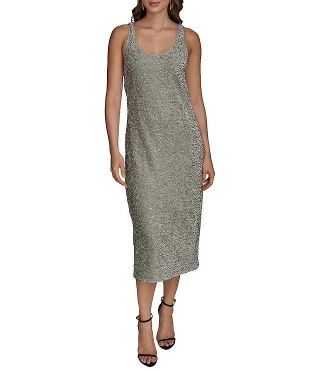 Donna Karan Beaded Velvet Scoop Neck Sleeveless Midi Sheath Dress