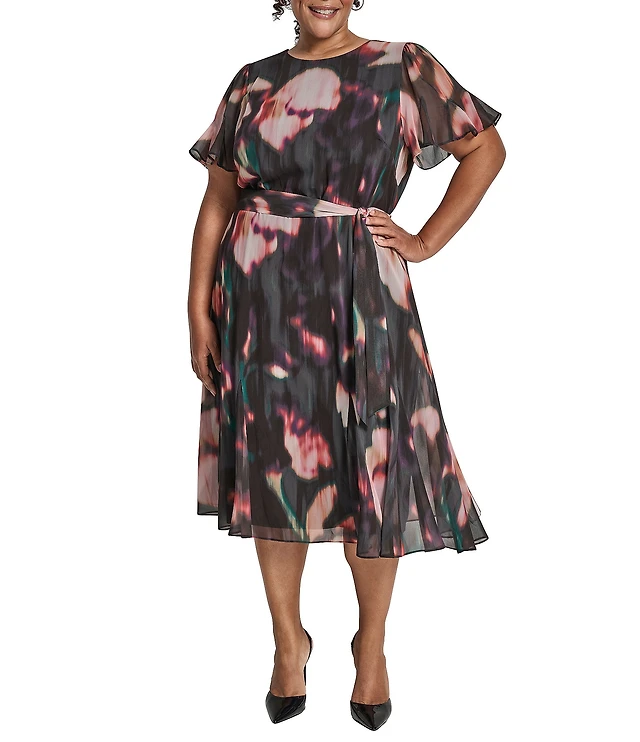 DKNY by Donna Karan Plus Size Chiffon Floral Print Short Sleeve Belted Fit and Flare Midi Dress