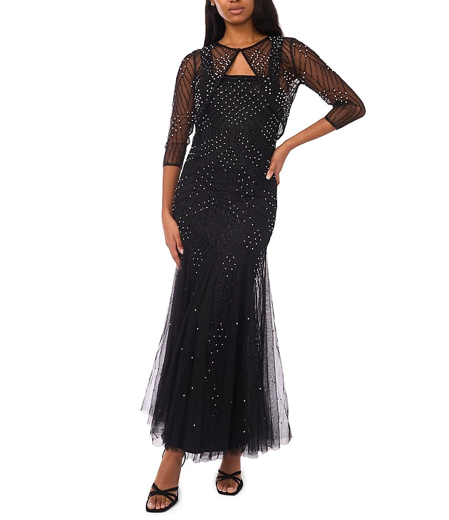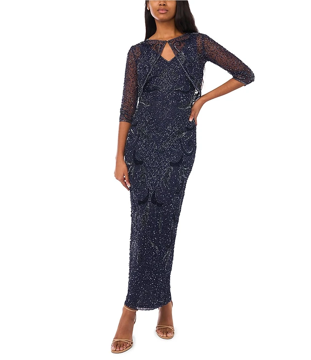 R & M Richards Embroidered Sequin Lace Poncho ITY Knit Sheath Gown