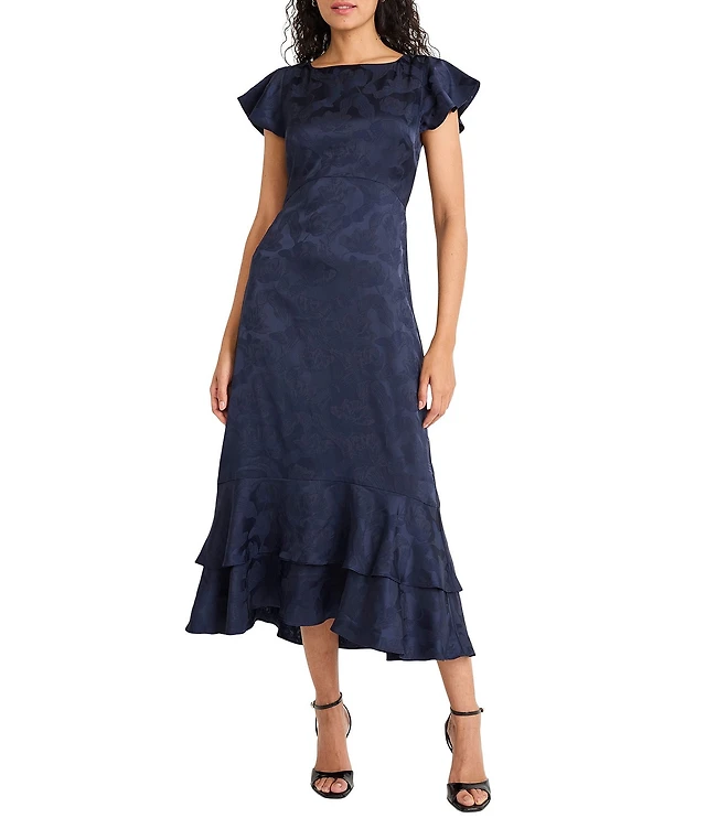 Adrianna Papell Floral Print Stretch Jacquard Crew Neck Bow Short Sleeve Sheath Dress