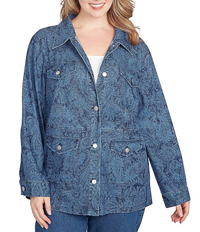 Ruby Rd. Plus Size Paisley Point Collar Long Sleeve Button Front Denim Jacket