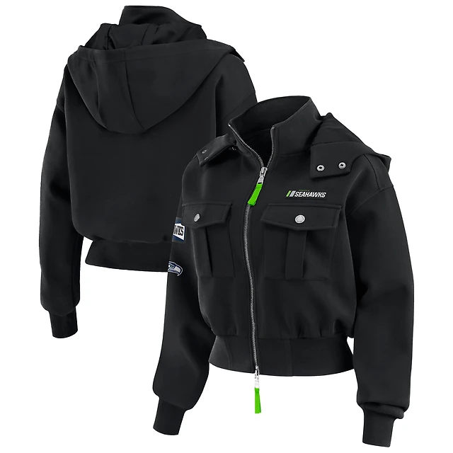 Women's WEAR by Erin Andrews Black Seattle Seahawks Tri-Blend Patch Pocket Cropped Full-Zip Bomber Hoodie Jacket