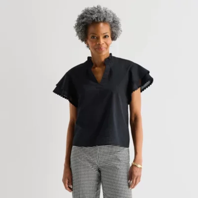 Liz Claiborne Womens Plus Mock Neck 3/4 Sleeve Ruffled Blouse