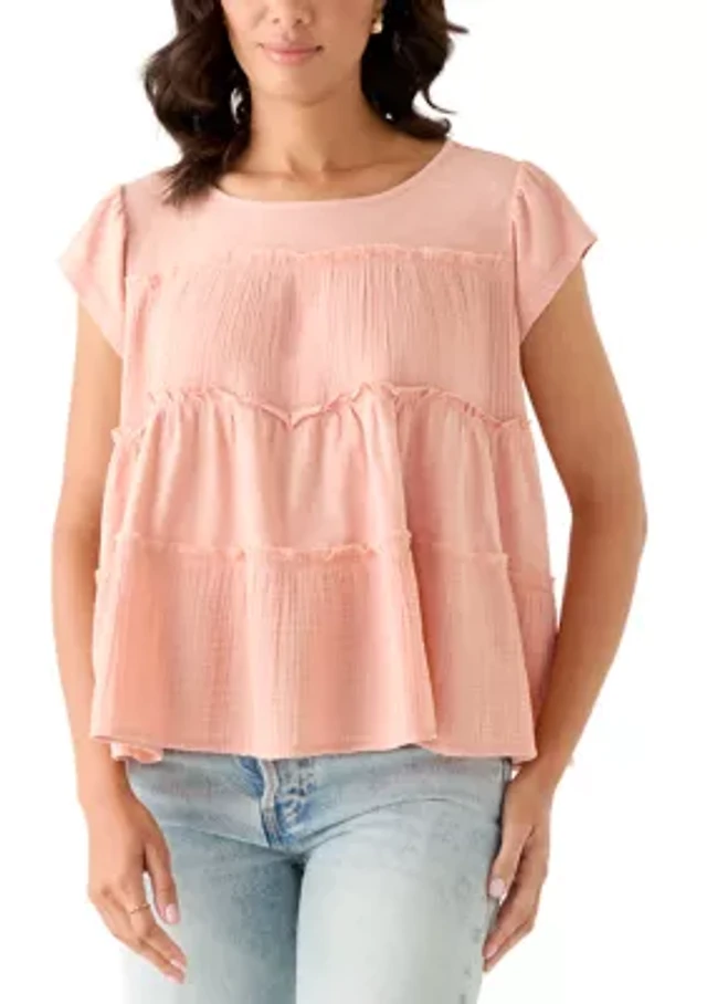 Women's Short Puff Sleeve Embellished Tier Top