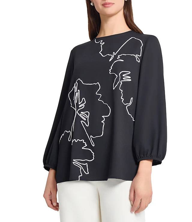 Karen Kane Linen Blend Bracelet Sleeve Embroidered Asymmetric Top