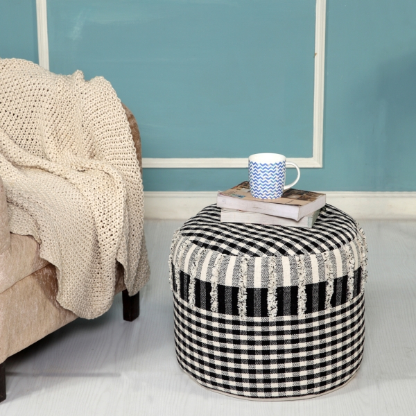 Black and Ivory Textured Plaid Pouf
