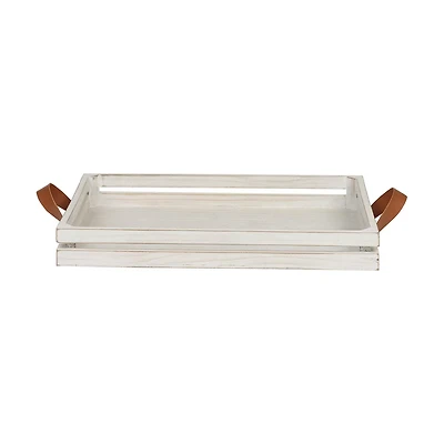 Rustic Wooded Tray with Faux Leather Handles, White, 15 in