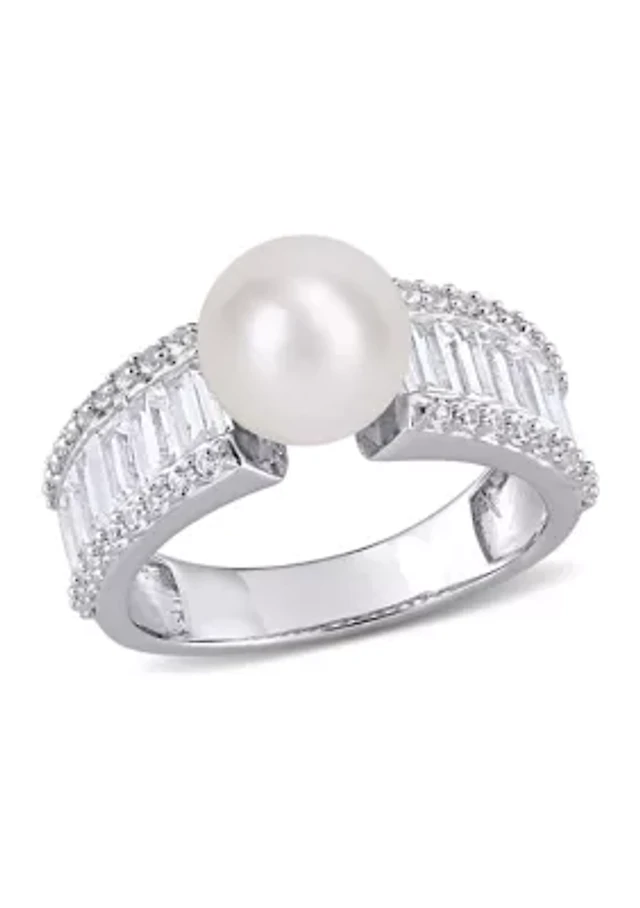 Lab Created 8-8.5mm Cultured Freshwater Pearl and 2 2/5 CT TGW White Sapphire Engagement Ring Sterling Silver