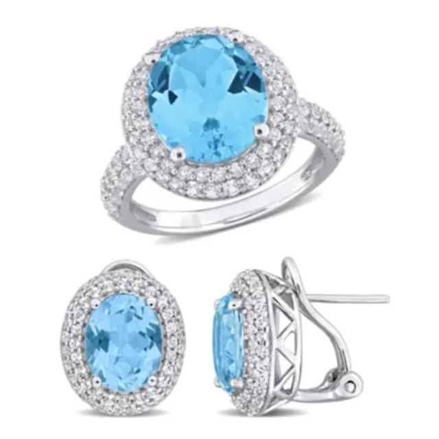 2-Pc Set of Sky Blue & White Topaz Double Halo Ring Earrings Sterling Silver