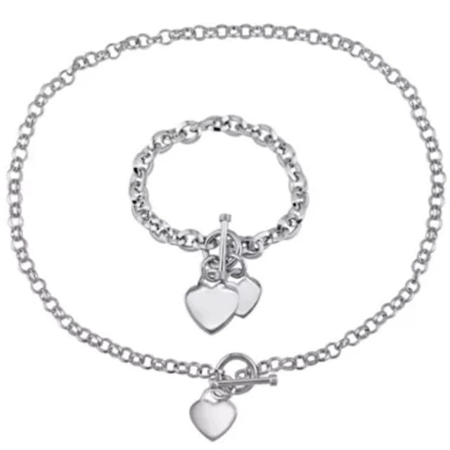 Circle Link Heart Charm Necklace and Bracelet 2-Piece Set in Sterling Silver