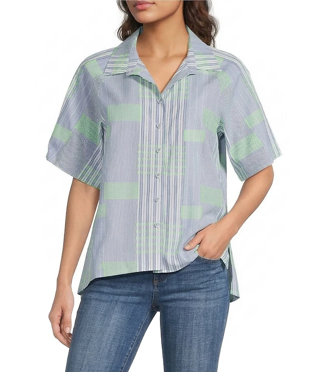 Ali Miles Petite Size Yarn Dye Plaid Clipped Jacquard Point Collar Short Dolman Sleeve Button-Front Shirt