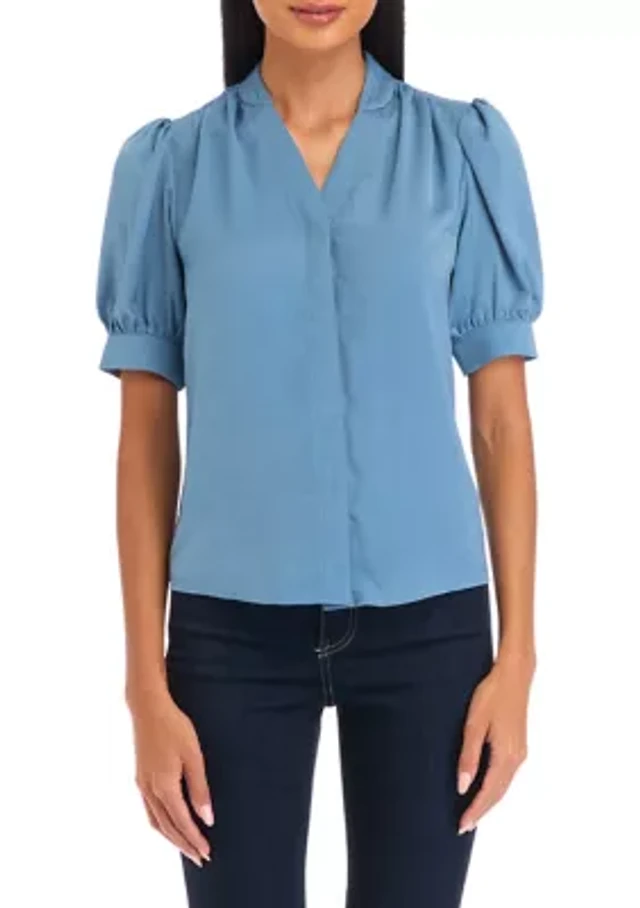 DKNY by Donna Karan Park Satin Point Collar Short Puff Sleeve Button Front Blouse