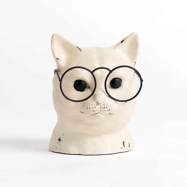 Distressed Cream Cat with Glasses Figurine