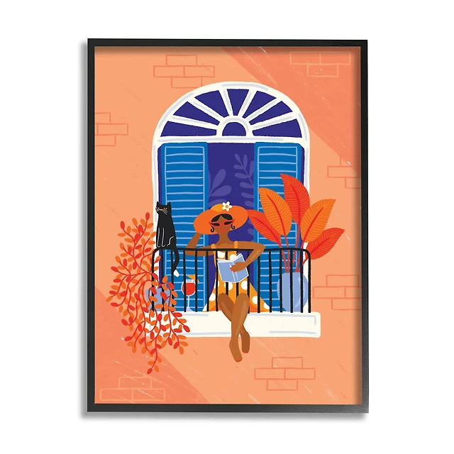 Stupell Industries Woman Reading Balcony Perched Cat Tropical Plants in Frame Wall Art