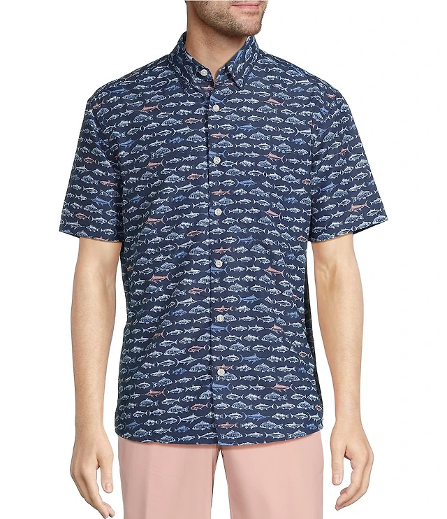 Roundtree & Yorke The Charter Vented Performance Button Down Collar Short Sleeve Map Print Sport Shirt