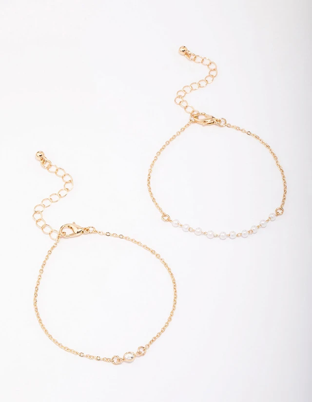 Gold Plated Freshwater Pearl Cubic Zirconia & Chain Bracelets 2-Pack