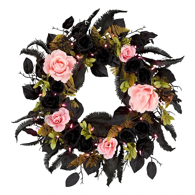 24" Cute & Creepy Black & Pink Flower Halloween Pre-Lit LED Wreath