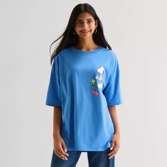 Womens Juniors Crew Neck Short Sleeve Oversized Peanuts Graphic T-Shirt