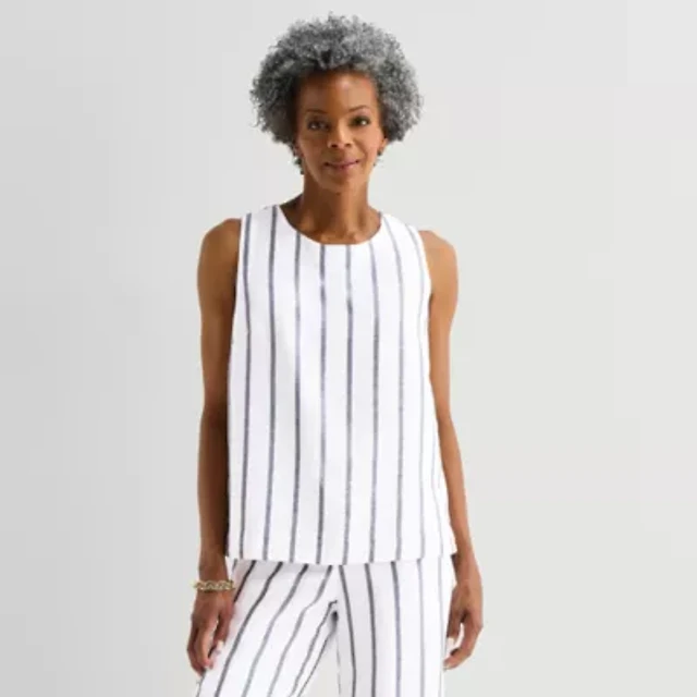 Ming Wang Pinstripe Stand Collar V-Neck 3/4 Sleeve Blouse