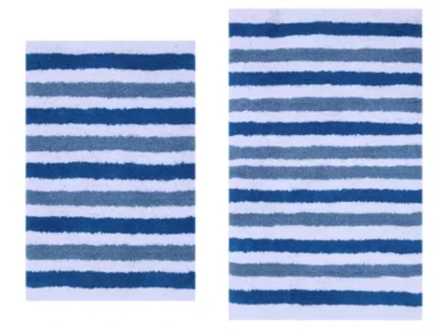 2 PC YARN DYED BATH RUG SET 17x24 & 21x34 CANDY STRIPE OCEAN BLUE