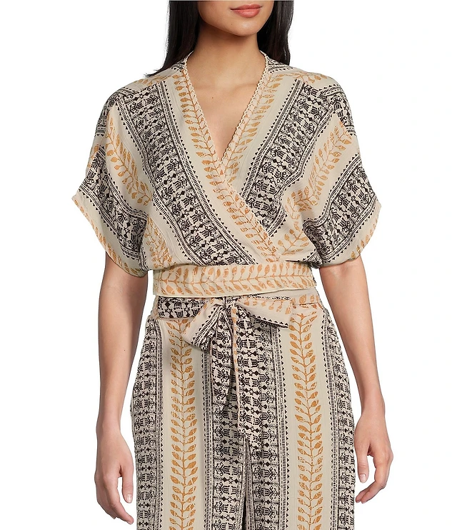 Angie Printed Surplus V-Neck Flutter Sleeve Wrap Cropped Top