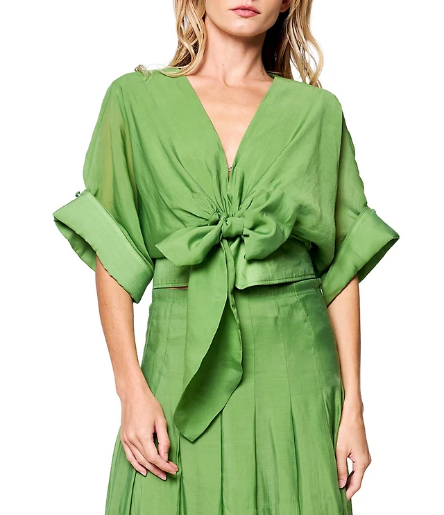 CIEBON Clarisa Solid V-Neck Roll-Tab Sleeve Tie Front Coordinating Crop Top