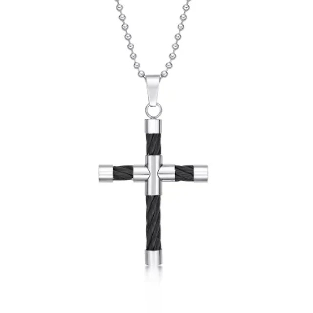 Mens Black Agate Two-Tone Stainless Steel Cross Pendant Necklace