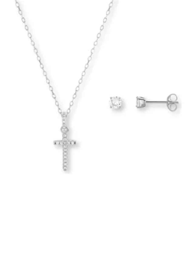 Stainless Steel & Cubic Zirconia Cross Pendant Necklace & Bracelet Set