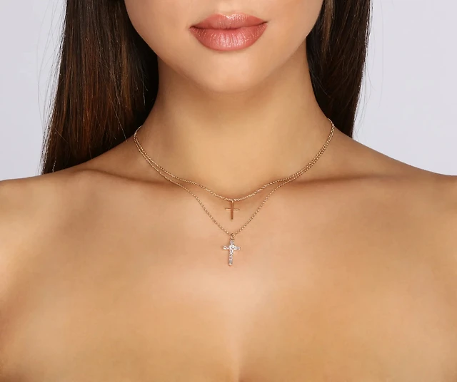 Cubic Zirconia Layered Cross Necklace Charm in Sterling Silver