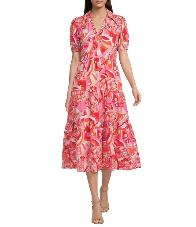Jude Connally Portia Knit Jude Cloth Mod Party Peony Print Short Puff Sleeve V-Neck Tiered Dress