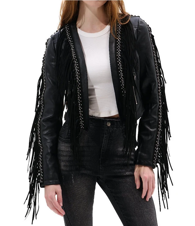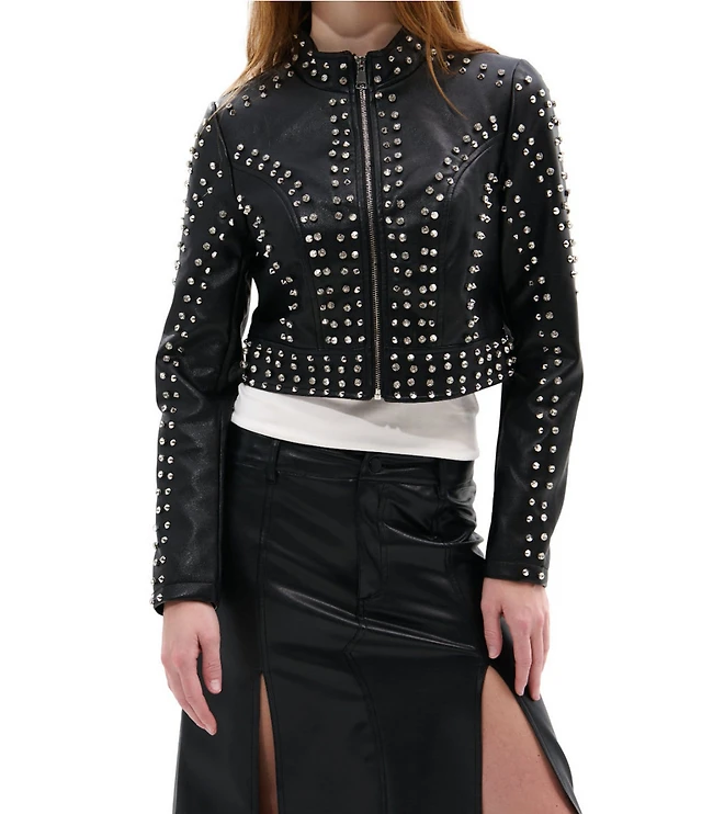 Women's Cuce Black New England Patriots Vegan Leather Full-Zip Moto Jacket with Rhinestones