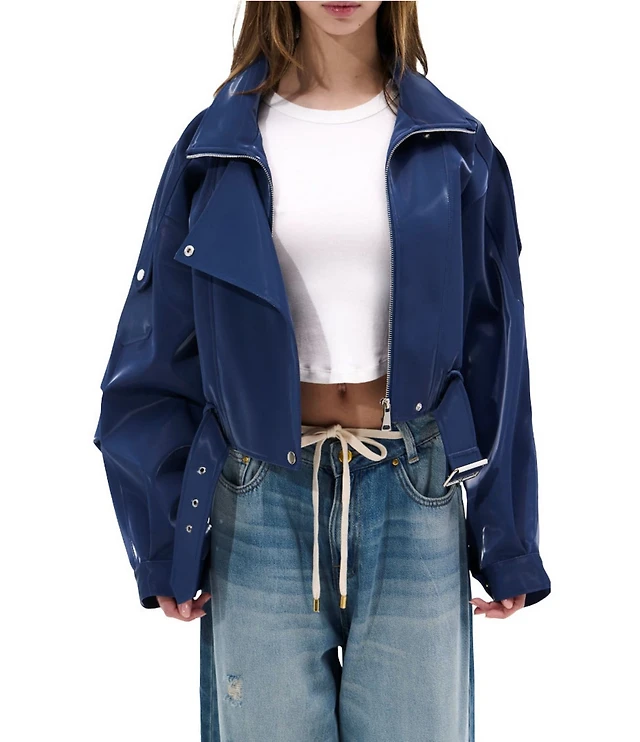 Azalea Wang Remy-Midnight Soft Faux Leather Notch Collar Belted Zip Front Moto Jacket