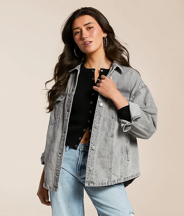 APNY Denim Collarless Long Sleeve Cropped Denim Jacket