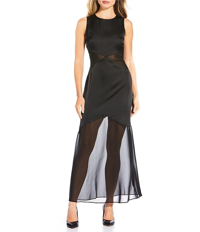 Donna Morgan Charmeuse Mesh Side Slit Sleeveless Maxi Dress