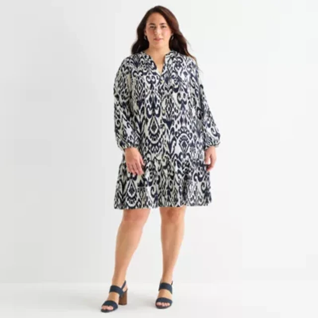 Be by CHETTA B Womens Plus Long Sleeve Abstract Shift Dress