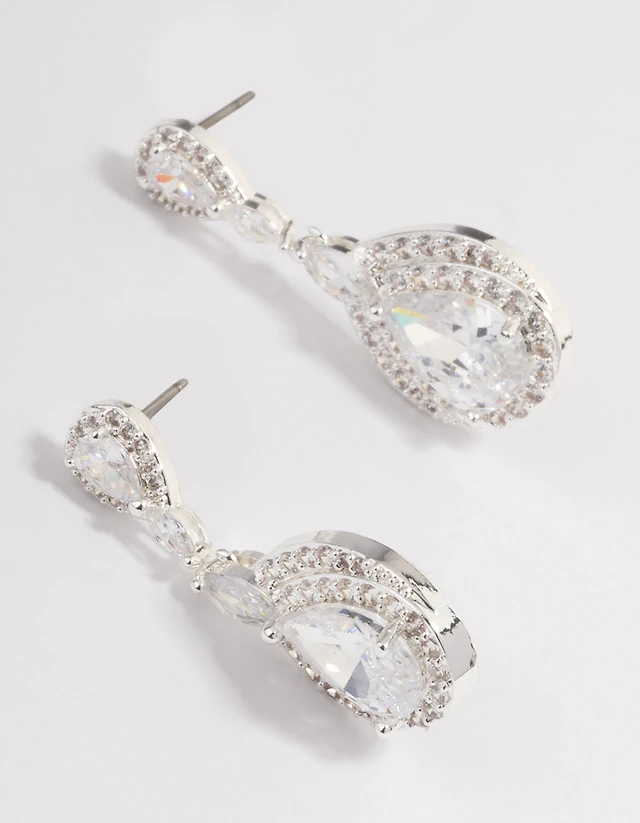 Silver Cubic Zirconia Double Halo Drop Earrings