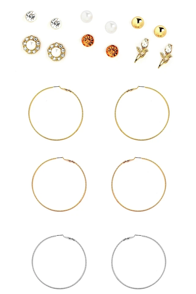 Gold Hoop & Diamante Stud Earrings 8-Pack