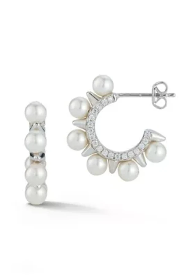 Sterling Silver Pearl and CZ Spike Hoop Earrings